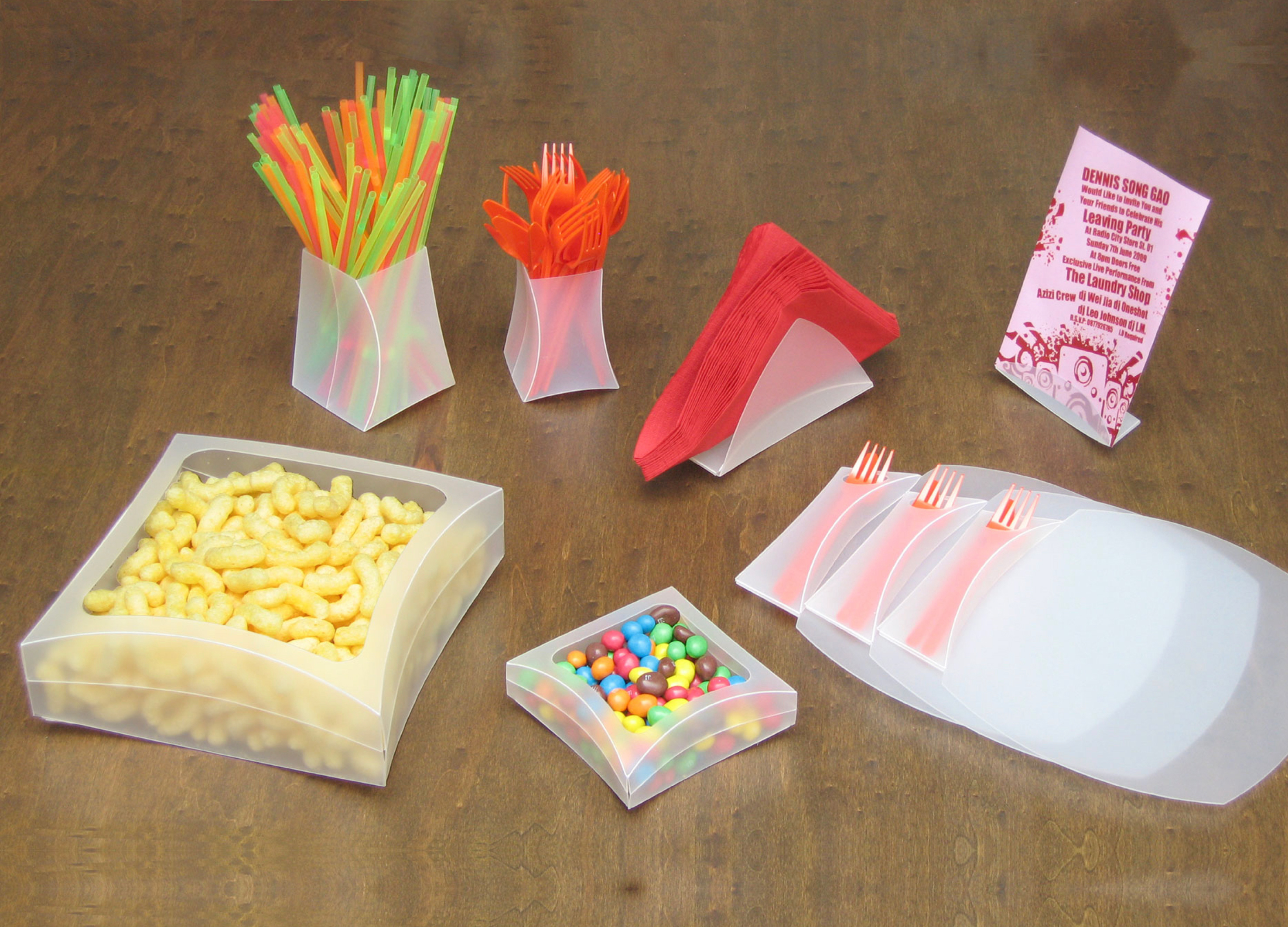 Reinterpretation of party tableware, as a self contained folding set.Quick assembly from flat to 3D, with pop-up effect.New structural aesthetics with curved surfaces and living hinges.Reusable folding PP version complying with disposable plastics ban in Europe.