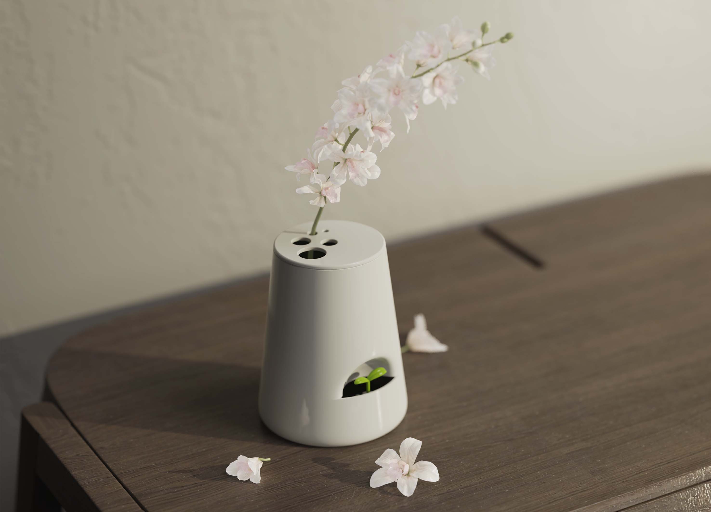 A vase design that solves the unintuitive amount of water in the vase by cutting the vase and floating it. China's flower consumption market is becoming more and more mature, the number of registered flower enterprises reached 6 million, most users will take flowers home will be placed in the vase maintenance, to extend the flowering period, but many flowers are not suitable for the net bubble in a large number of water, while some vases can not intuitively tell the user the remaining water in the vase, therefore, the water in the vase needs to be replaced and supplemented in time.The design prevents users from watering too much at one time by limiting their behavior. At the same time, the water surplus in the vase is reflected by floating, which uses green leaves, flowers, and other shapes to remind users and give positive feedback in life, creating small happiness in life.