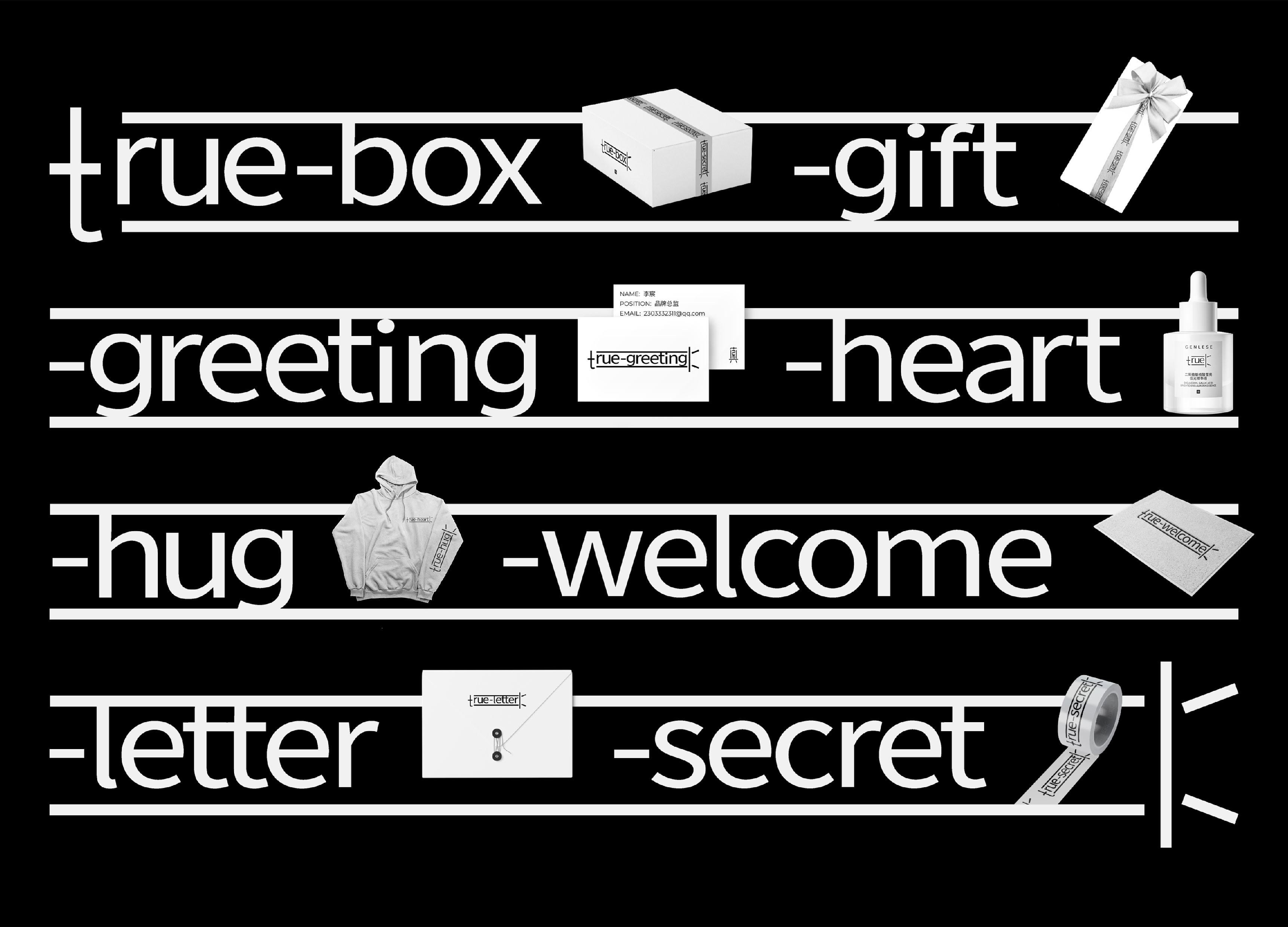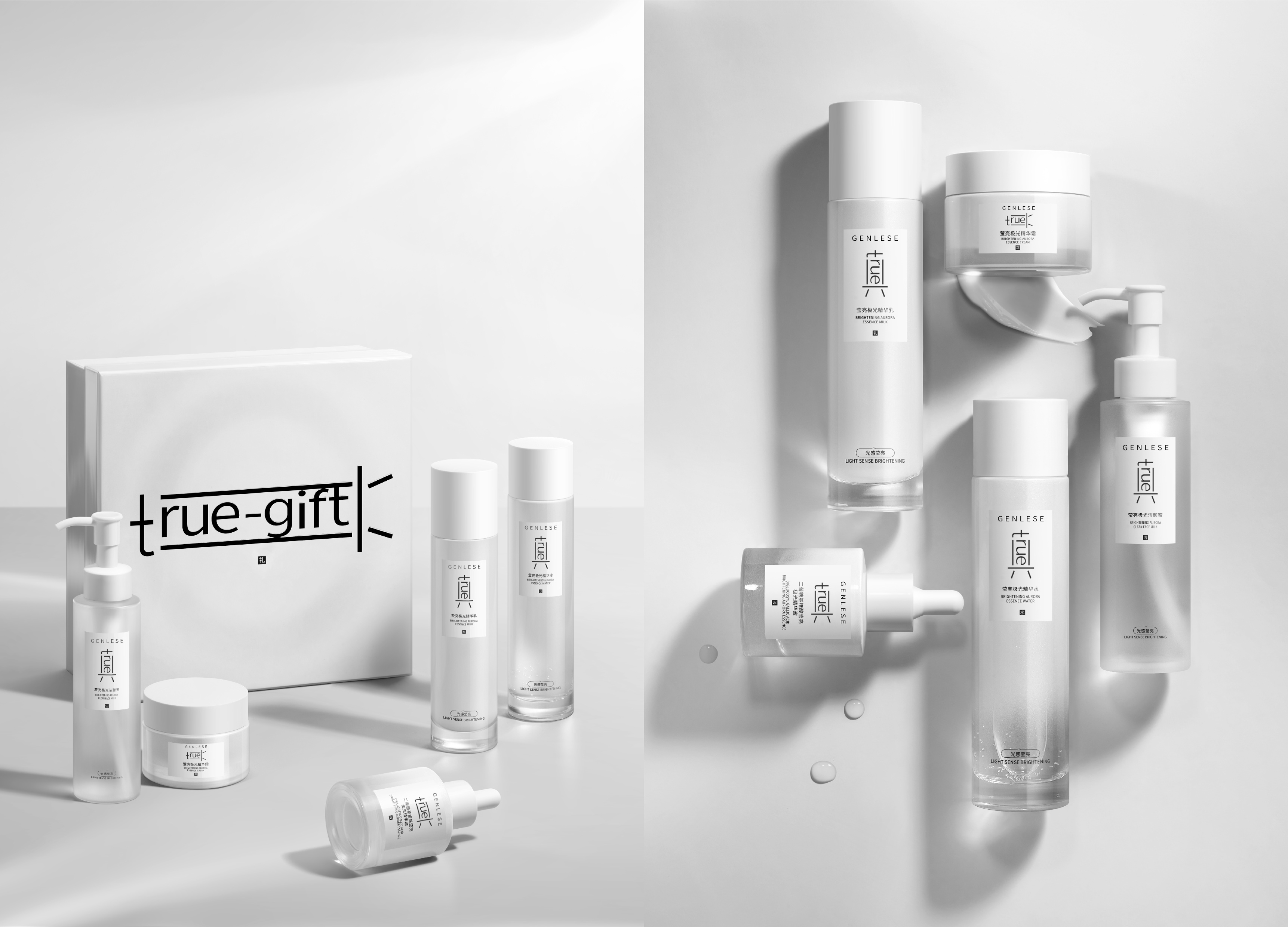 Project Briefing: "GENLESE" is a Chinese skin care brand that advocates "ingredientism, authentic beauty". This is a brand upgrade design for it. - Creation Description: "GENLESE" is a Chinese skin care brand that advocates "ingredientism, authentic beauty". As an old domestic skin care brand focusing on raw materials, "GENLESE" still uses the Chinese character "真" as the conceptual prototype for this design update, and combines the English "true" with the Chinese word "真" to match the brand's transformation strategy for rejuvenation. The combination of Chinese and English texts brings a graphic sign with both "localization" and "internationalization". The uniqueness of the new graphic logo lies in its own "variability" brought about by the combination of Chinese and English texts. In the dynamic design of the graphic logo, we stretch and change the word "true" to fill in the corresponding brand keywords, and the dynamic changes of the input text continue to strengthen the "textuality" of the graphic language, and also bring more imagination space for the extended design. The "pure text combination" design language of the overall brand vision allows information to return to the most "authentic" text state to echo the brand concept.As an established national skincare brand, GENLESE's brand upgrade design helps to enhance the image of national skincare brands and strengthen consumers' confidence in domestic skincare products. The diversity and inclusiveness of the brand image can promote social diversity and inclusiveness and enhance the sense of belonging of consumers from different cultural backgrounds.