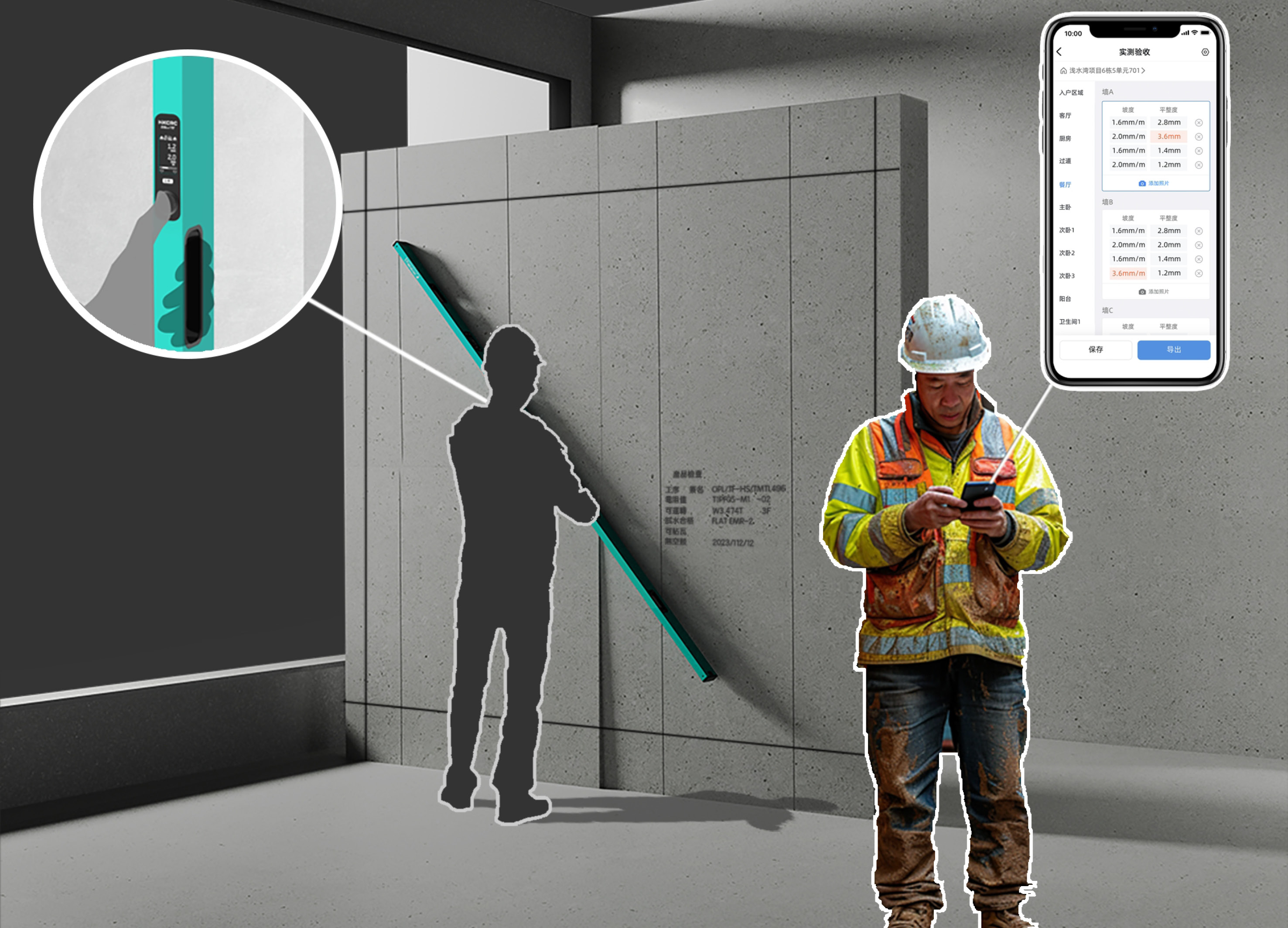The IoT Smart Level flatnessmeter offers functionalities for measuring flatness, inclination, and verticality. Utilizing multi-sensor fusion technology, it efficiently and accurately measures flatness. Paired with an APP data management system, it allows for one-click data recording and exportation of spreadsheets, eliminating the need for manual writing. It is ideal for construction documentation, prefabricated component inspection, installation, formwork angle measurement, and wall and floor acceptance.The IoT Smart flatnessmeter boasts three significant advantages: Comprehensive Measurement Capabilities: It allows for the simultaneous measurement of flatness, levelness, and verticality with high precision. The flatness accuracy reaches ±0.5 millimeters, while the levelness and verticality accuracy can achieve ±0.05 degrees. Elimination of Manual Gauging: By removing the need for hand-held gauges, the measurement efficiency is increased by 55%. Integration with Data Logging App: When paired with a data recording application, it eliminates the need for manual data entry and spreadsheet management, streamlining the data handling process.The IoT Smart Flatnessmeter features the capability to measure flatness, inclination, and verticality. Through multi-sensor fusion technology, it efficiently and accurately measures flatness. Paired with an APP data management system, it allows for one-click data recording and the export of spreadsheets, eliminating the need for manual handwriting throughout the process. It is suitable for various scenarios including construction documentation and prefabricated component inspection, installation, formwork angle measurement, and wall and floor acceptance.